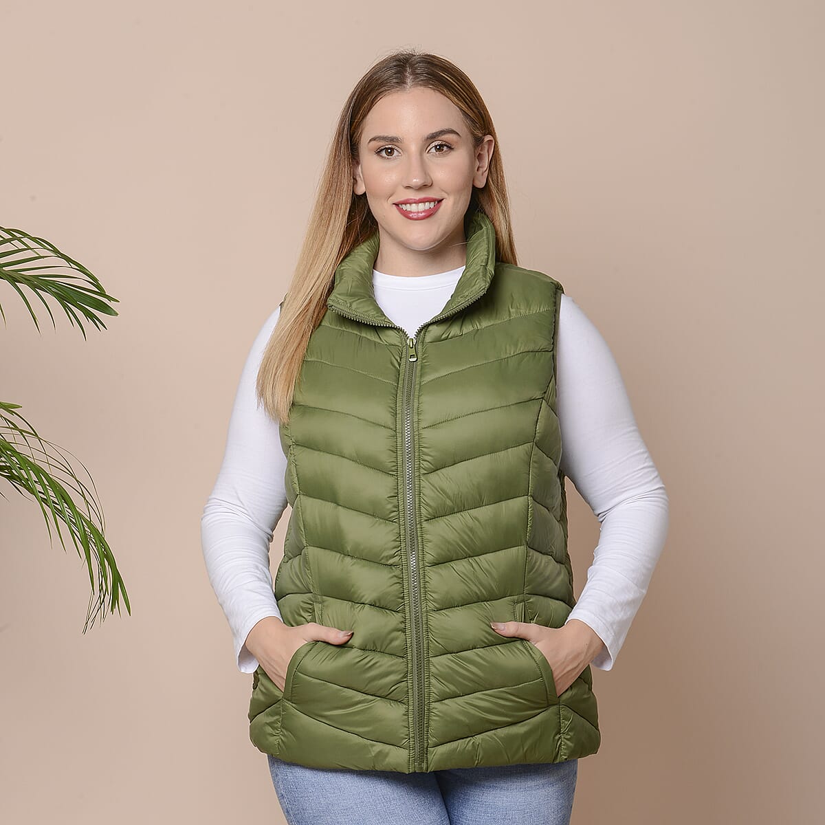 PASSAGE Olive Green Women's Zip Front Puffer Vest with Pockets (XL, 100% Polyester)