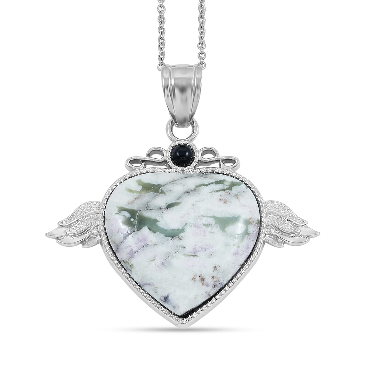 Peace Jasper and Black Onyx 41.50 ctw Angel Wing Heart Pendant in Silvertone with Stainless Steel Necklace 20 Inches