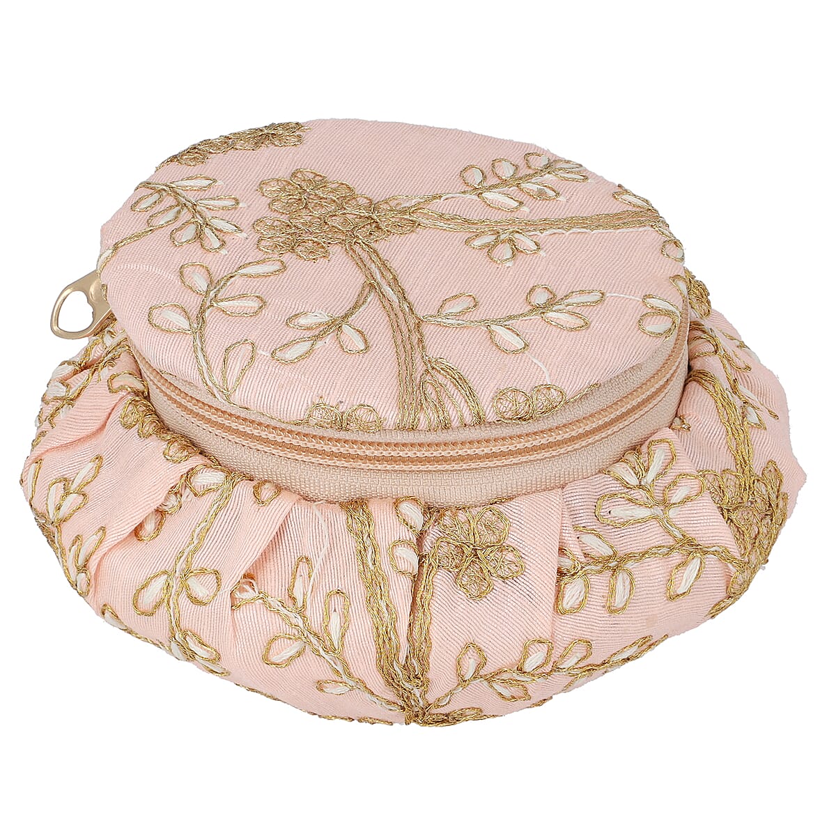 Peach Embroidered Brocade Pot-shaped Jewelry Box With Velvet Scratch resistant Interior And Zipper Closure