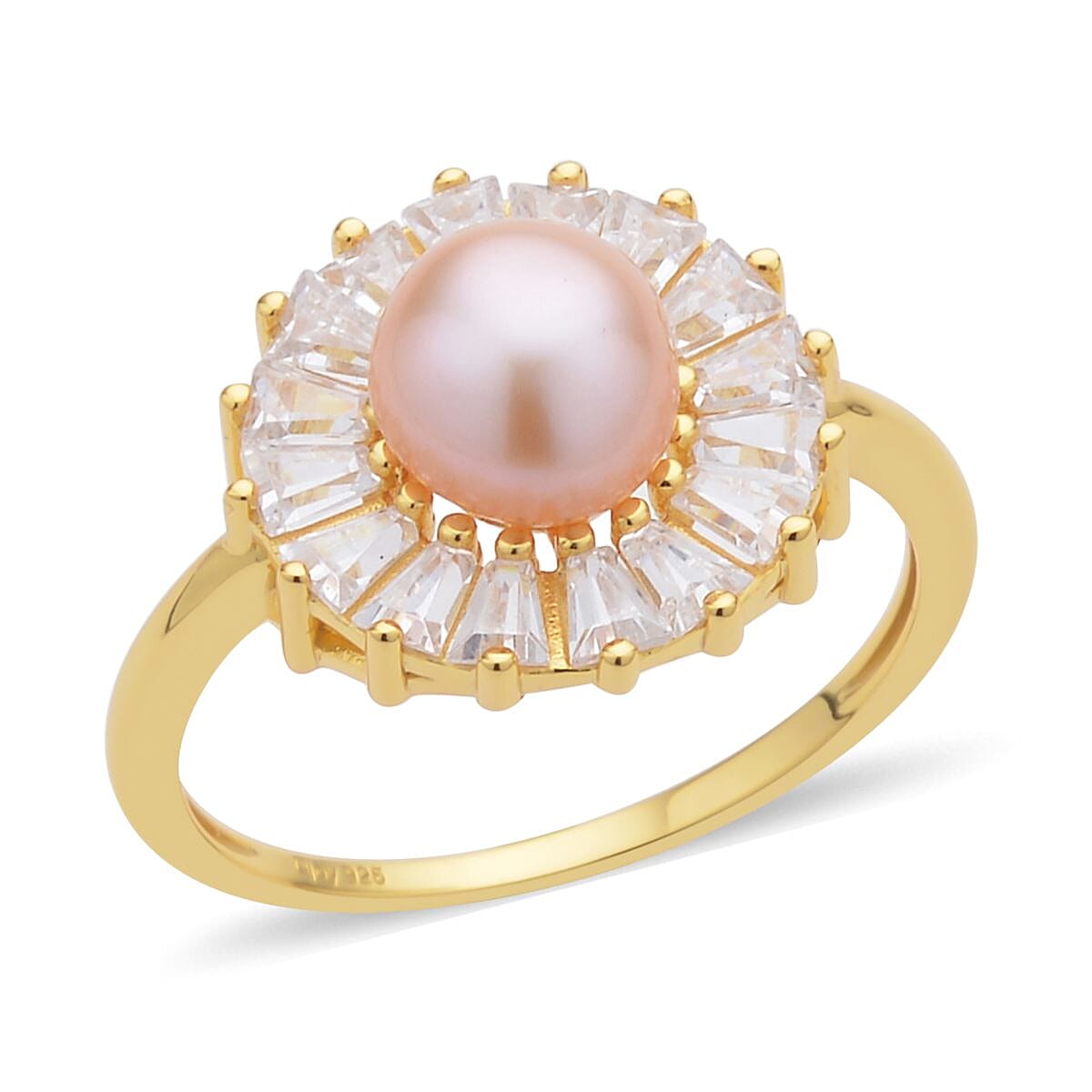 Peach Freshwater Pearl and Simulated Diamond Floral Ring in 14K Yellow Gold Over Sterling Silver (Size 10.0) 1.00 ctw
