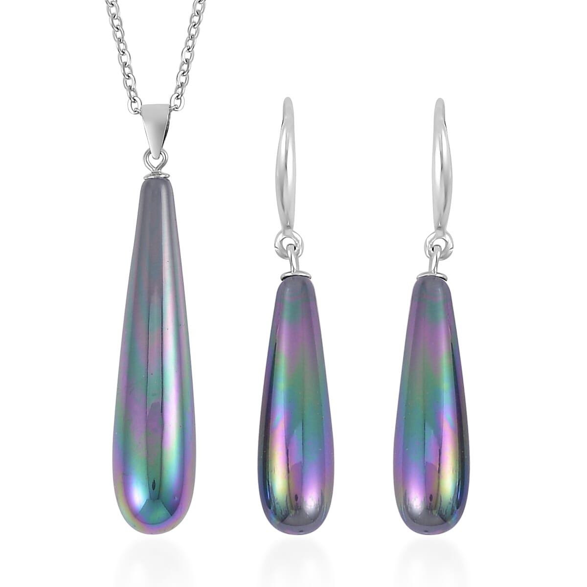 Peacock Color Shell Pearl Drop Pendant Necklace 20 Inches and Earrings in Stainless Steel