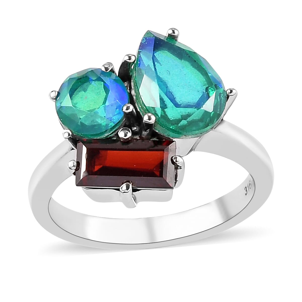 Peacock Quartz, Mozambique Garnet 3 Stone Ring in Stainless Steel (Size 8.0) 3.80 ctw | Tarnish-Free, Waterproof, Sweat Proof Jewelry