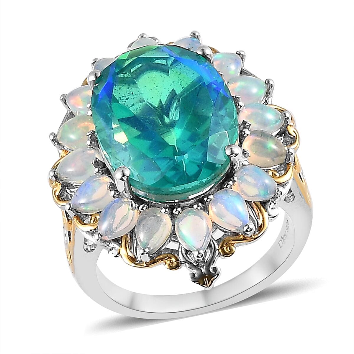 Peacock Quartz (Triplet) and Ethiopian Welo Opal Halo Ring in Vermeil YG and Platinum Over Sterling Silver (Size 7.0) 11.90 ctw