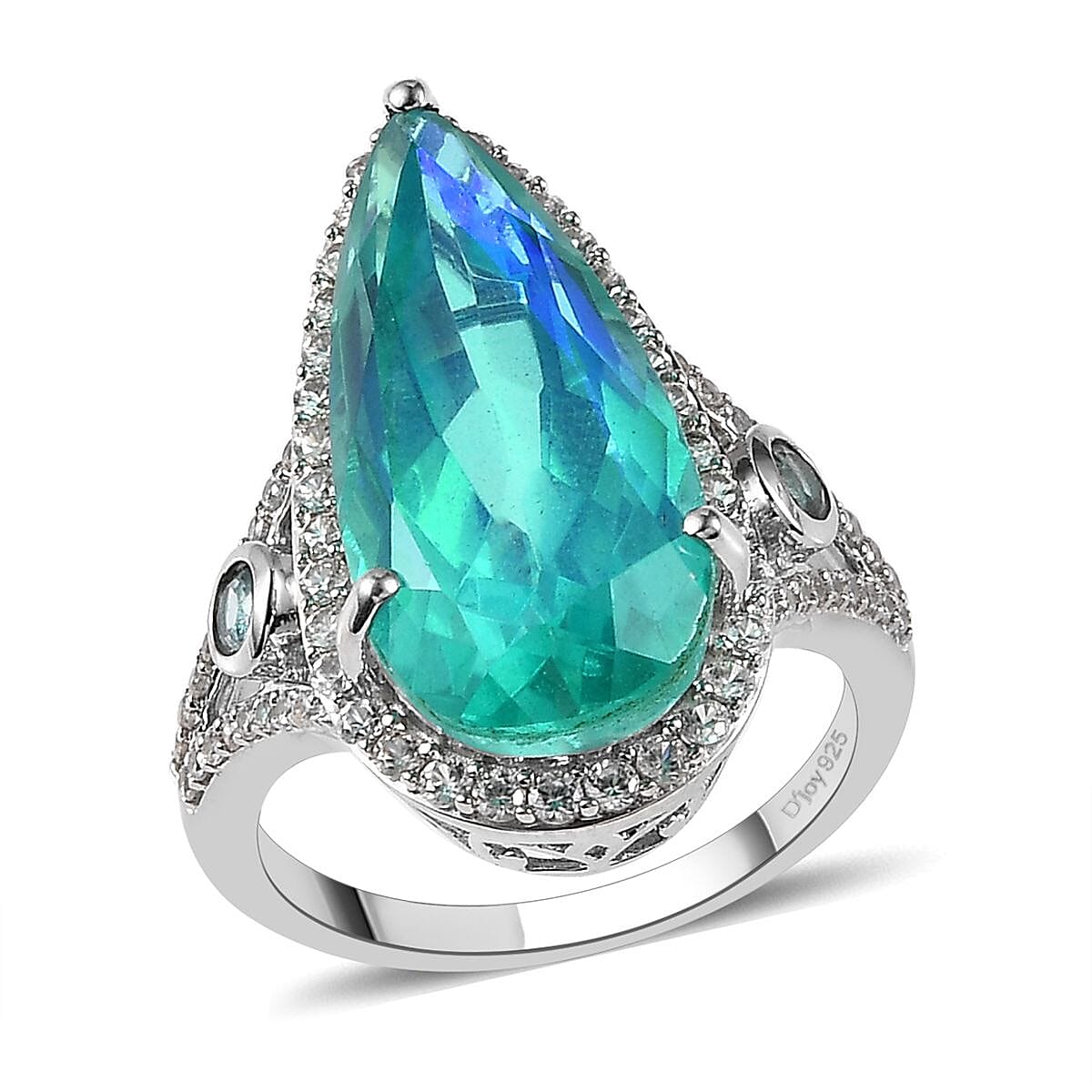 Embrace the opulence of the peacock quartz triplet ring, a masterpiece crafted to captivate and enchant. Its mesmerizing hues and halo design are a tribute to the beauty of nature's artistry, encapsulated in a silver ring that promises to be the centerpiece of any occasion. The blend of luxurious sterling silver with platinum plating and the vibrant array of multi-gemstones create an irresistible dazzling display of color and elegance.