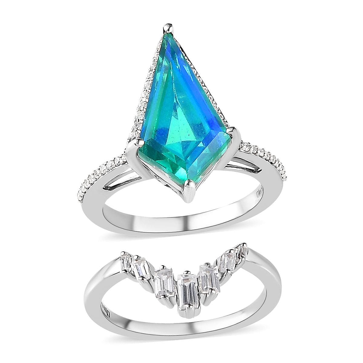 Peacock Quartz (Triplet) and White Zircon Set of 2 Stackable Ring in Platinum Over Sterling Silver 7.10 ctw (Del. in 7-10 Days)