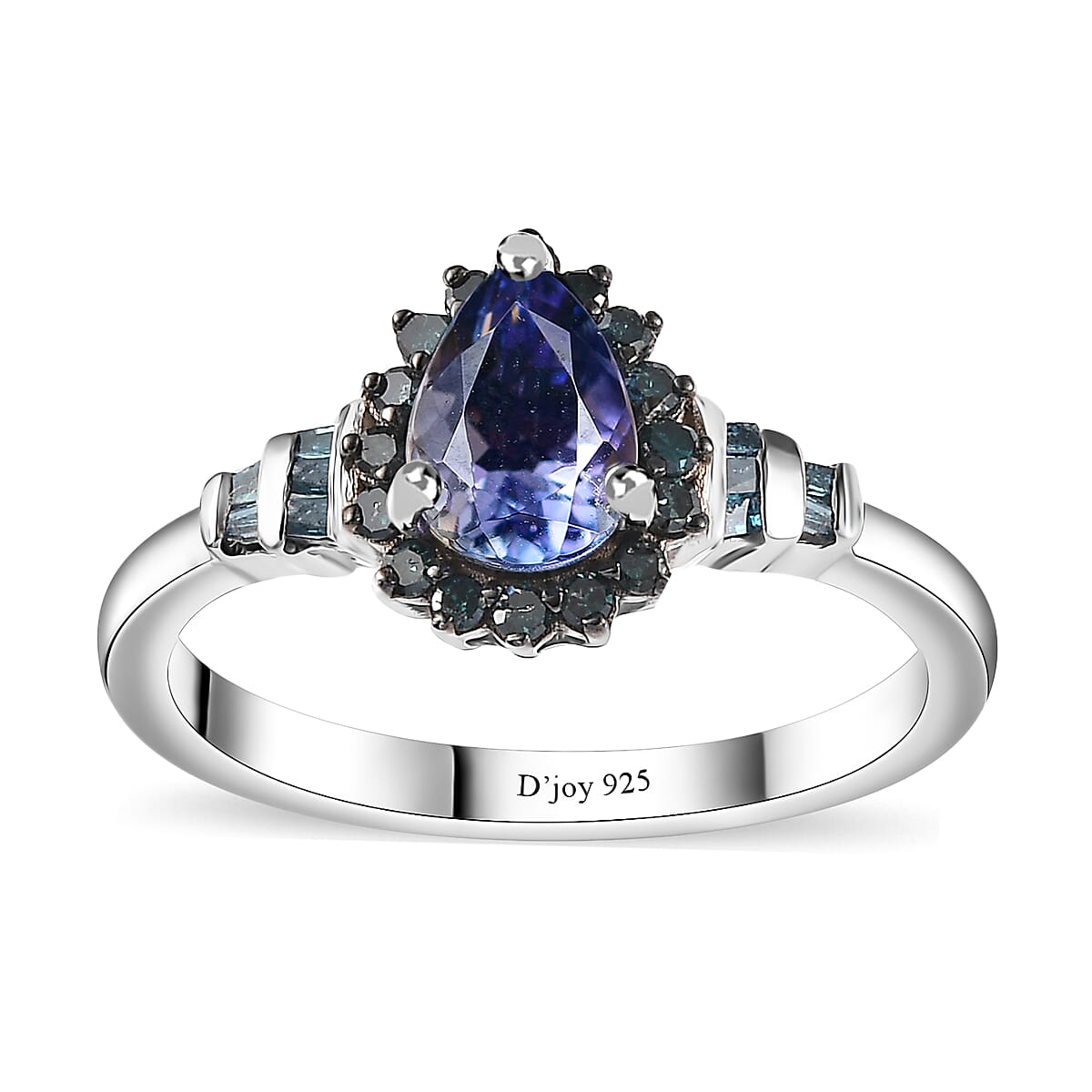 Adorn your fingers with this peacock tanzanite and blue diamond ring. This peacock tanzanite ring features a prong-set pear-shaped tanzanite at its center, surrounded by a brilliant blue diamond halo and flanked with blue diamonds along the shank. Expertly crafted in rhodium over sterling silver, this ring exudes elegance and sophistication.
