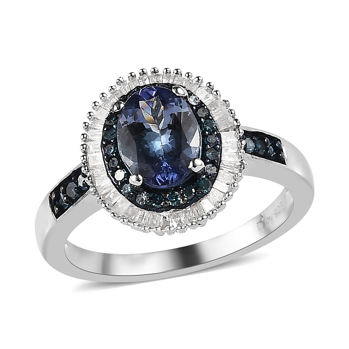 Peacock Tanzanite, Blue and White Diamond Double Halo Ring in Platinum Over Sterling Silver (Size 10.0) 1.75 ctw