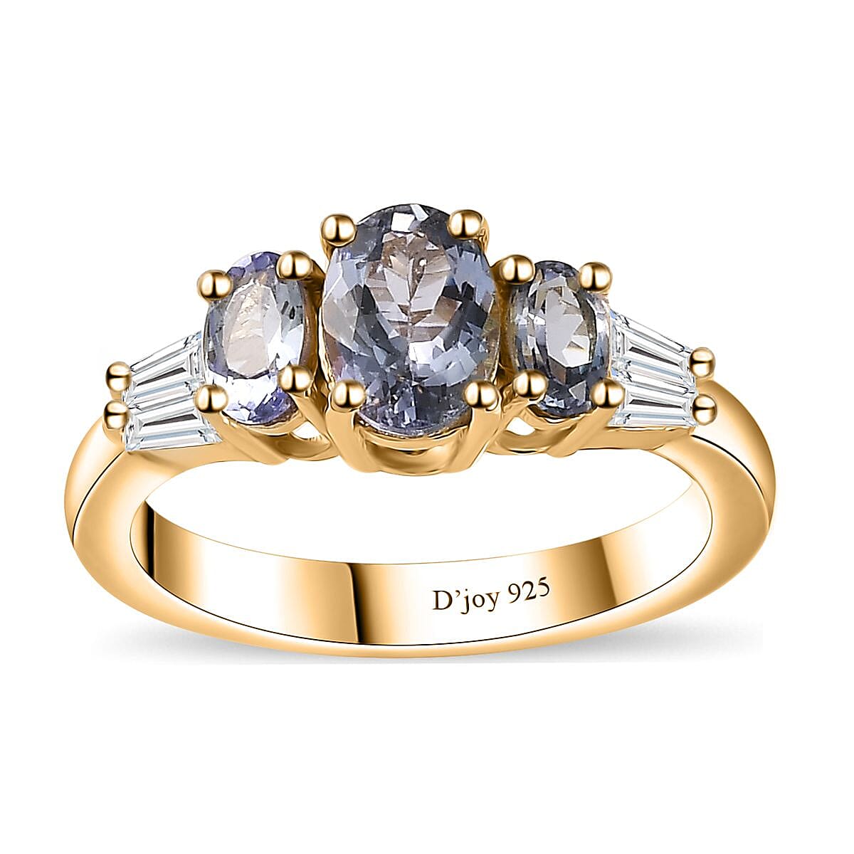 Elevate your ensemble with this peacock tanzanite and white zircon ring, a mesmerizing blend of trilogy design and sparkling charm. Crafted in 18K vermeil yellow gold over sterling silver, this tanzanite ring features a prong-set tanzanite trilogy at its center, flanked by baguette-shaped zircons on both sides.