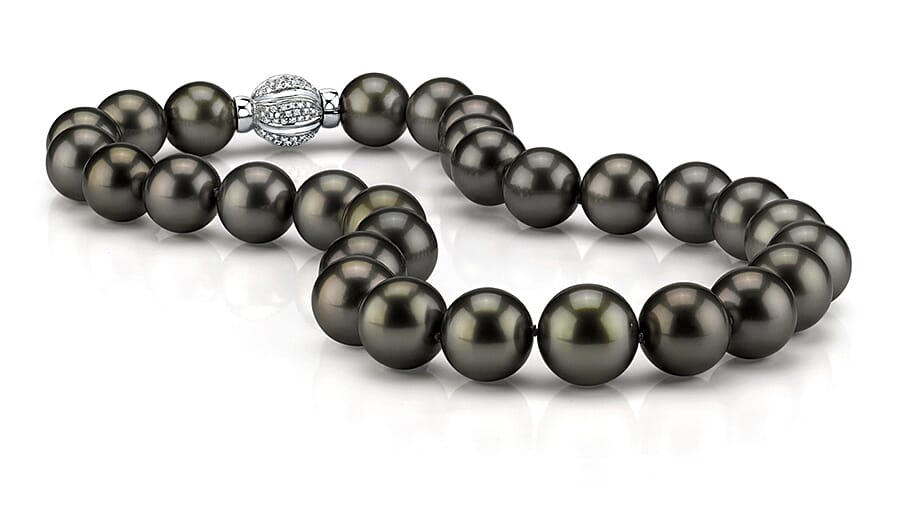 All pearls are unique, but Tahitian cultured pearls stand out as exotic. It is especially true of black pearls with colorful overtones. There’s no other pearl type with a color called “aubergine.” A necklace of clean, round, 14 mm, excellently matched, aubergine Tahitian cultured pearls is truly stunning!