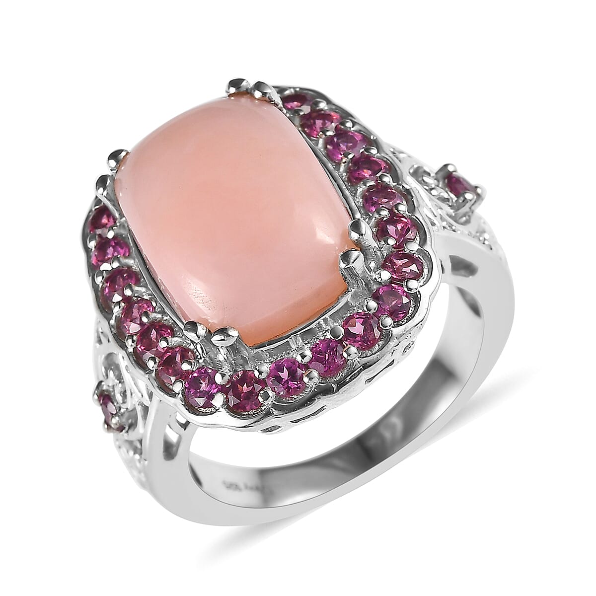 Peruvian Peruvian Pink Opal and Orissa Rhodolite Garnet Halo Ring in Platinum Over Sterling 6.40 ctw
