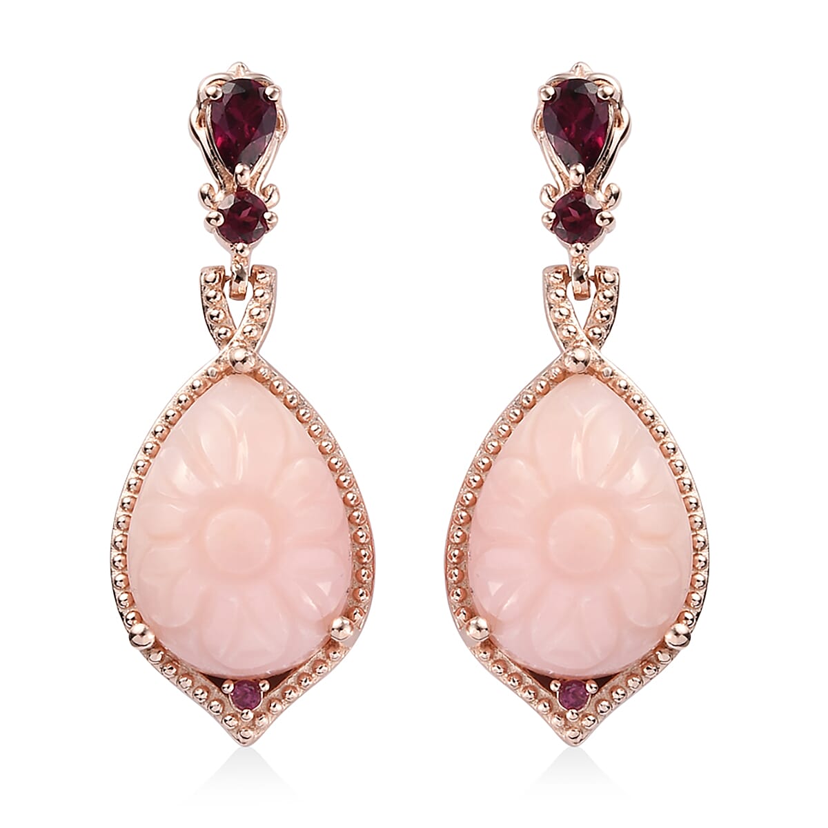 Peruvian Pink Opal Carved and Orissa Rhodolite Garnet Drop Earrings in Vermeil Rose Gold Over Sterling Silver 19.15 ctw