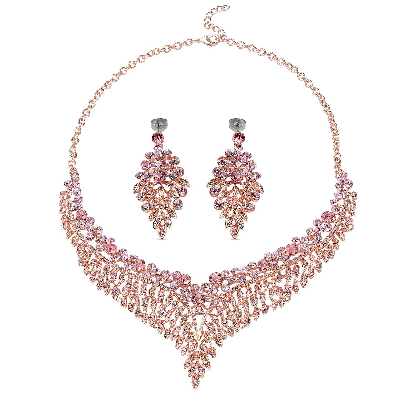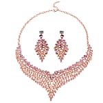 Pink Austrian Crystal Earrings and Bib Necklace in Rosetone 20-23 Inches