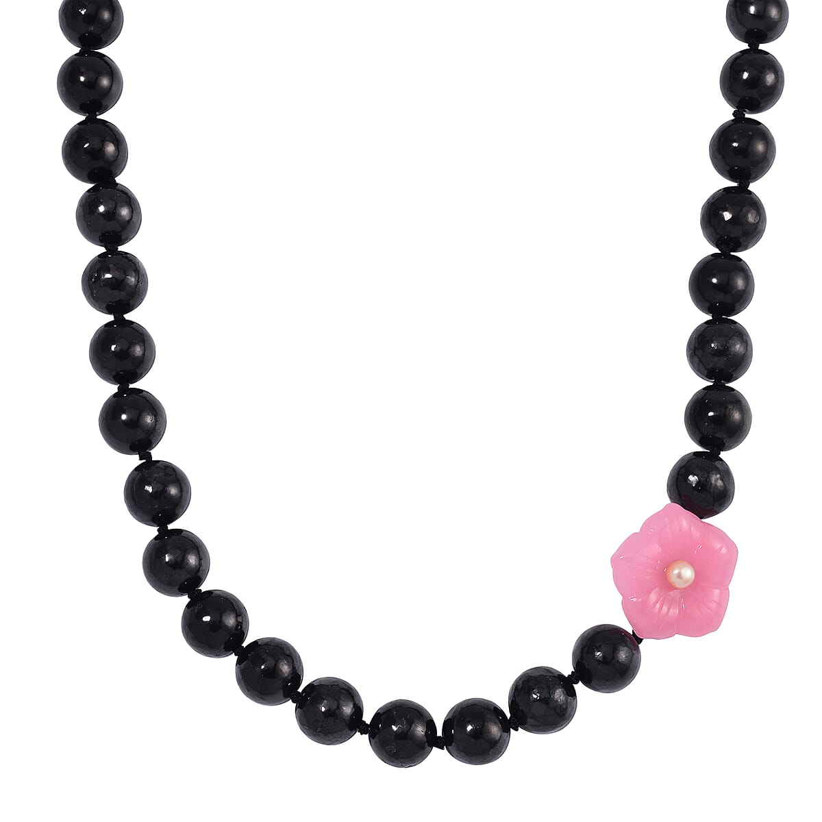 Pink Jade Carved Flower (D), Peach Freshwater Pearl, Shungite 461.00 ctw Necklace in Rhodium Over Sterling Silver 20 Inches