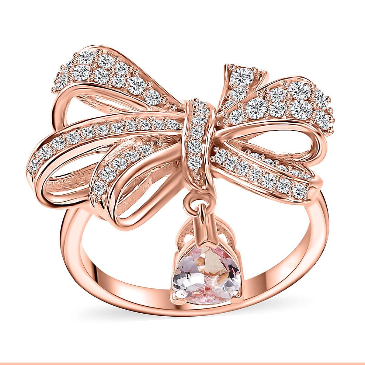 This pink morganite and moissanite bow knot ring, crafted in sterling silver, showcases a delightful blend of elegance and charm. A soft pink morganite is elegantly paired with sparkling moissanite stones in a sophisticated bow knot design, making this silver ring a perfect touch of refined whimsy.