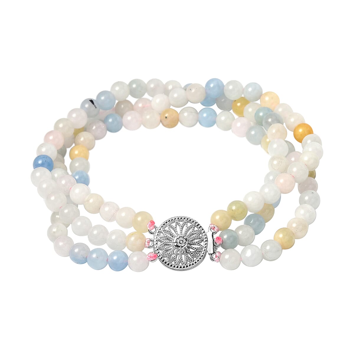 Pink Morganite, Aquamarine, Heliodor Beaded 3 Row Bracelet in Rhodium Over Sterling Silver (6.50 In) 88.85 ctw