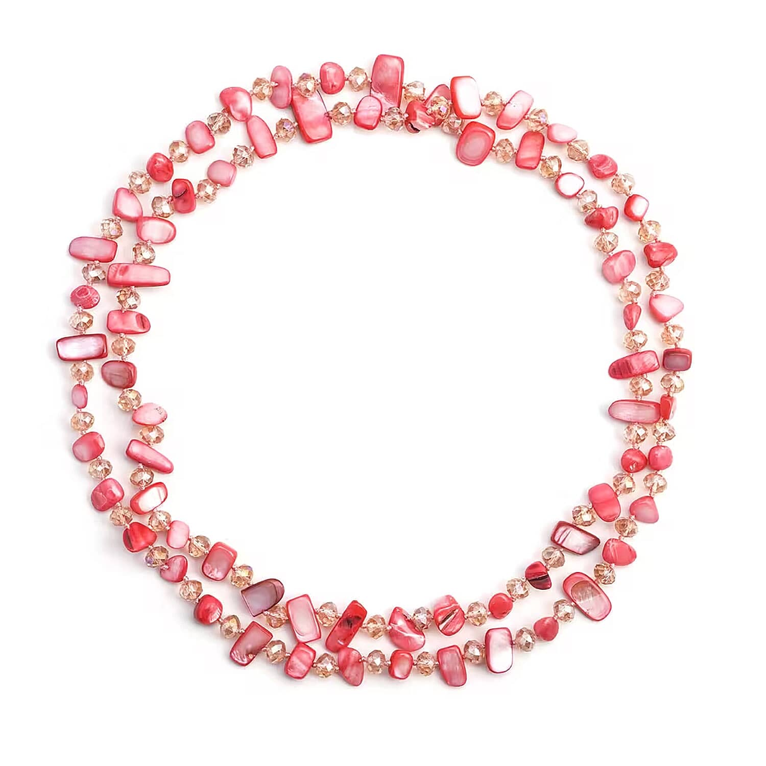 Pink Shell Chips and Pink Color Glass Beaded Necklace 47 Inches