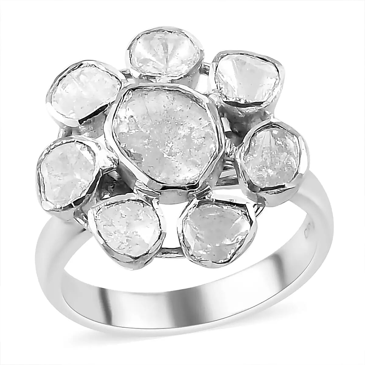 Polki Diamond Floral Ring in Platinum Over Sterling Silver (Size 9.0) 1.00 ctw