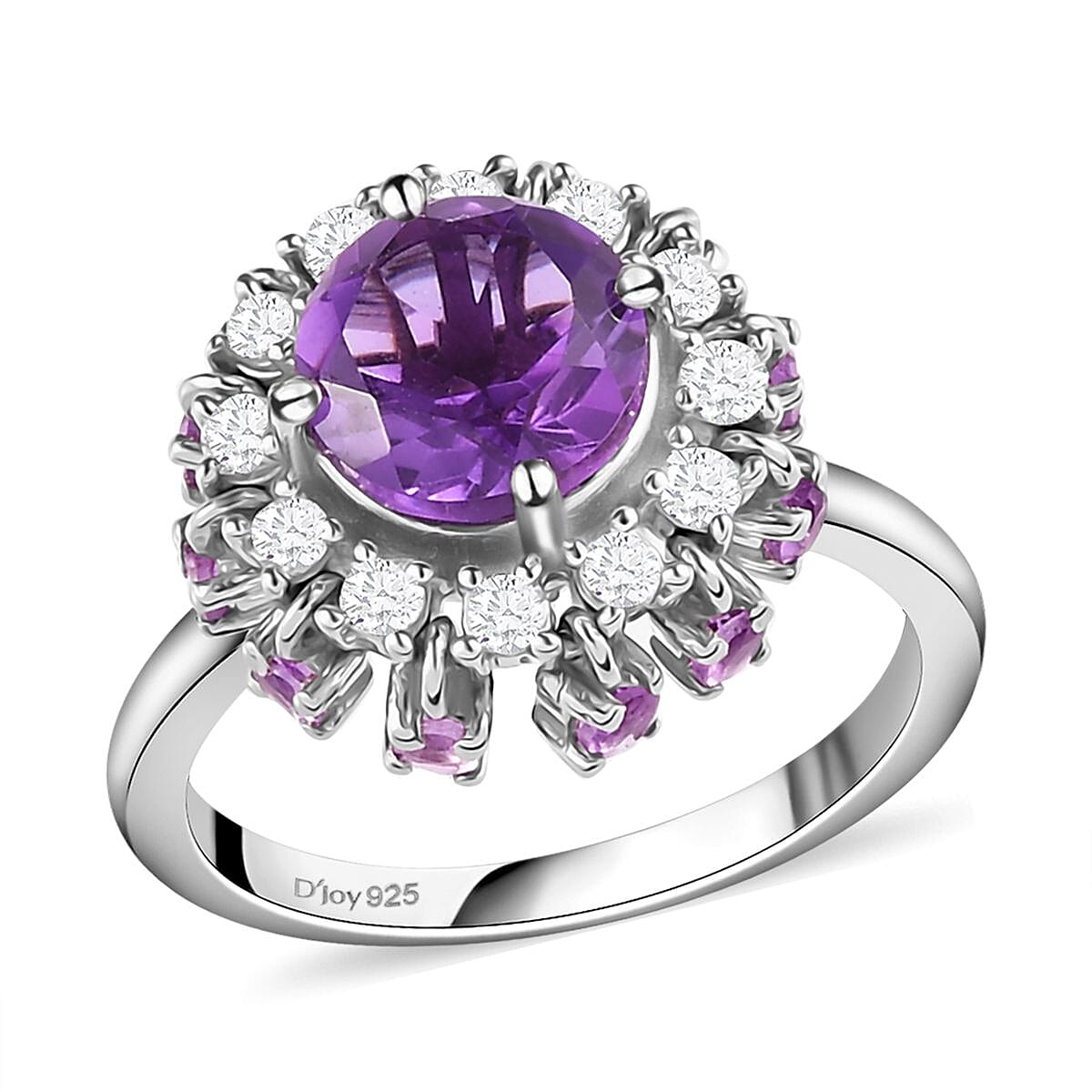 Crafted differently with a unique design, this premium amethyst ring is based on the 1920s-originated cocktail-style ring. Cocktail-style rings originated during the American prohibition era and were symbols of women’s liberty. Crafted in sterling silver with a platinum finish, this cocktail ring features a round-shaped amethyst in the center set using the prong setting. A halo of natural white zircons encircles the center gem beautifully which is then nestled in the halo of amethyst ovals that are set vertically giving it more volume and width. The use of the prong setting is done to ensure that all gemstones are securely set and offer maximum brilliance. This bold and beautiful amethyst cocktail ring is perfect to be worn when you are heading out for a celebration. Amethyst is a variety of quartz that gets its color from the presence of the iron element.
