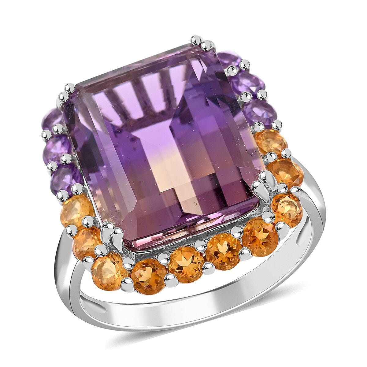 Embrace unparalleled elegance with the premium Anahi ametrine ring. Set in a captivating halo design, the super-sized octagonal gemstone takes center stage, secured by twin prongs. Complemented by a radiant halo of multi gemstone rounds and finished in lustrous rhodium over sterling silver, this ring epitomizes luxury.
