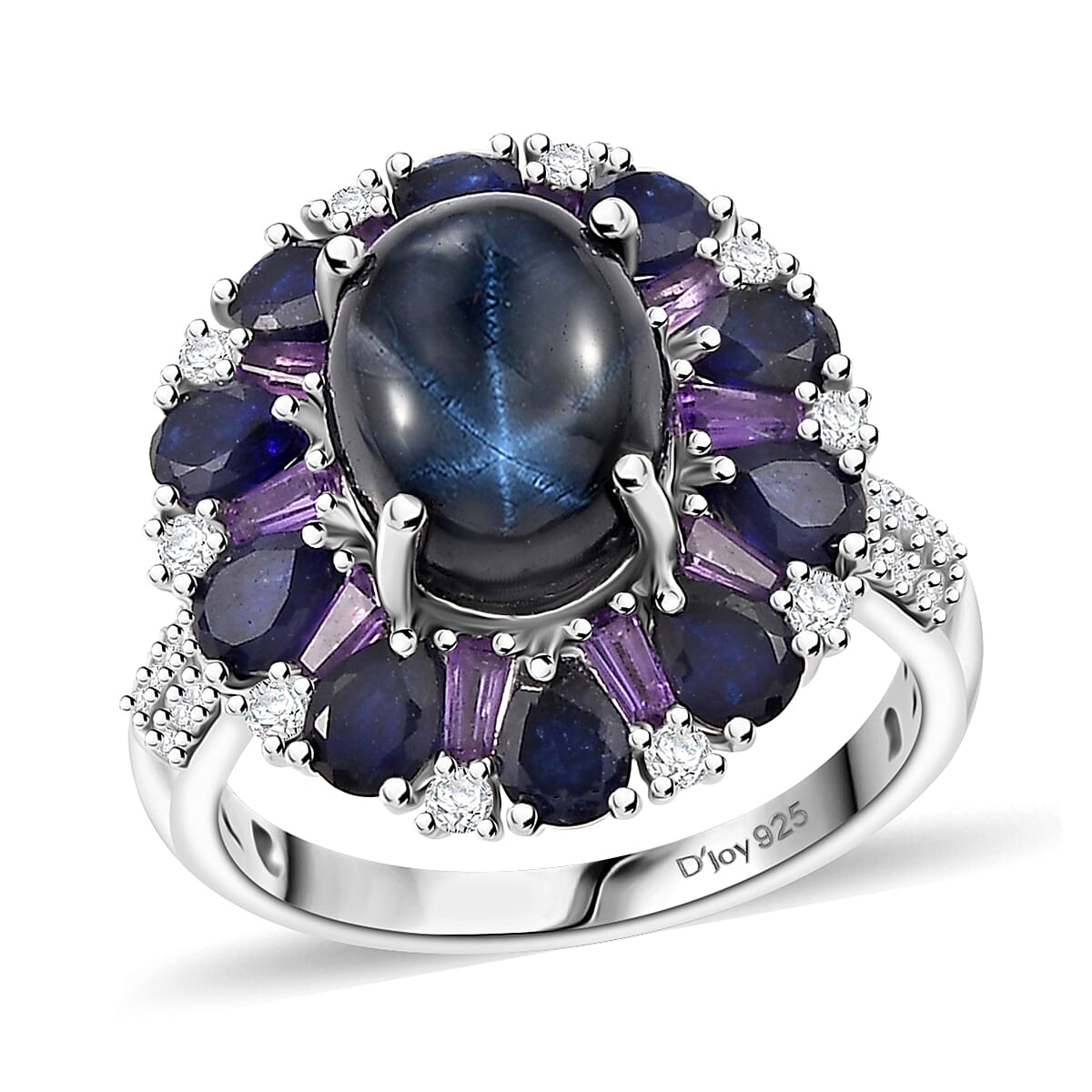 Premium Blue Star Sapphire (DF), White Zircon Starlight Ring in Rhodium Over Sterling Silver (Size 6.0) 8.10 ctw