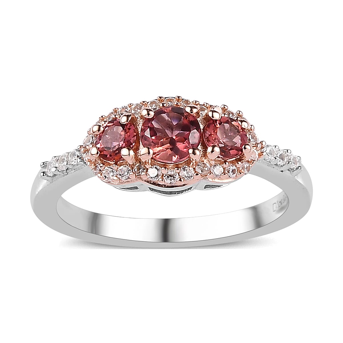 Premium Blush Tourmaline and White Zircon Trilogy Ring in Vermeil RG and Platinum Over Sterling Silver (Size 9.0) 0.80 ctw