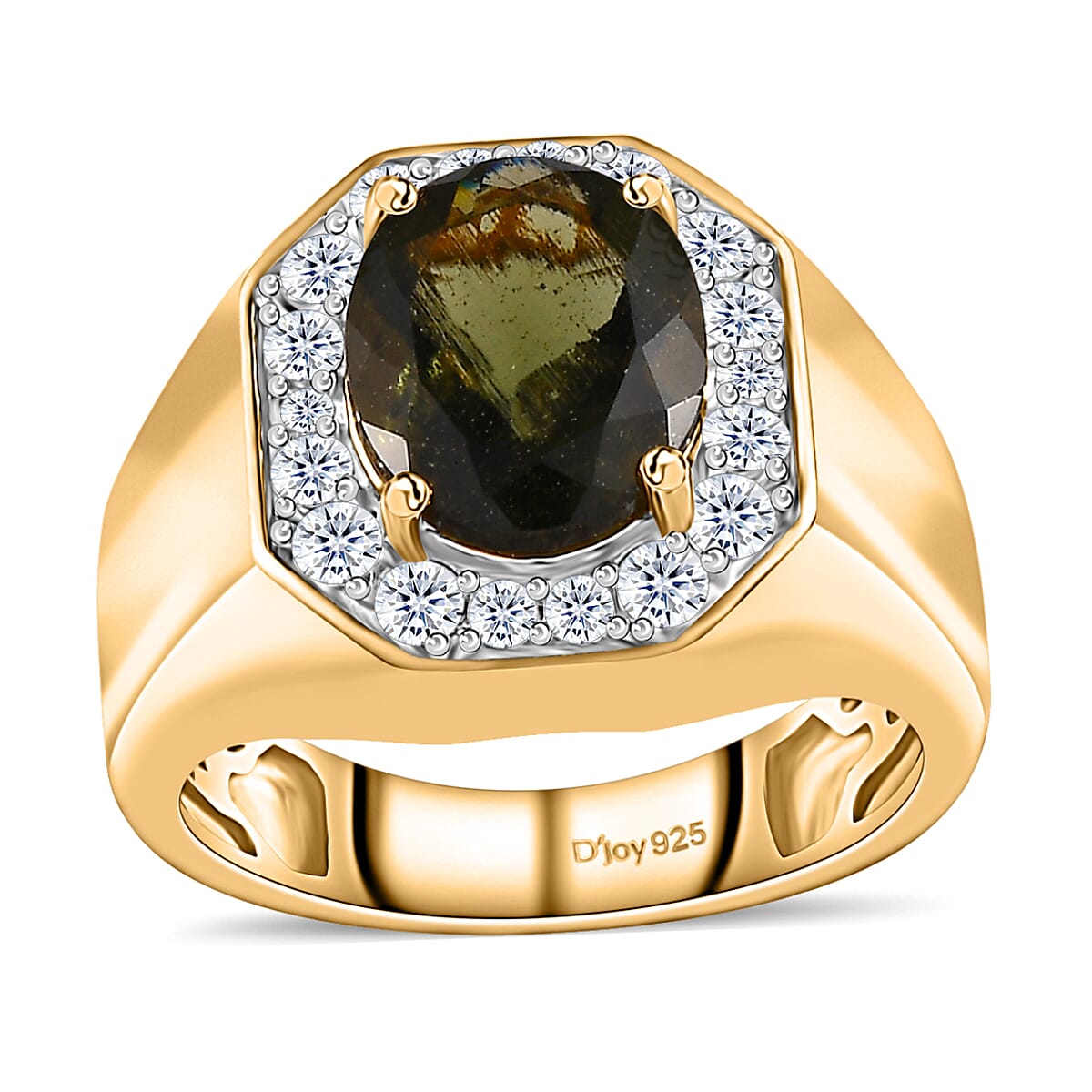 Premium Bohemian Moldavite and White Zircon 4.00 ctw Men's Ring in Vermeil Yellow Gold Over Sterling Silver (Size 14.0)