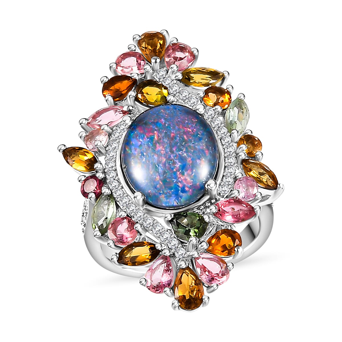 Premium Boulder Opal (Triplet) and Multi Gemstone 6.20 ctw Forest Bloom Ring in Rhodium Over Sterling Silver (Size 9.0)