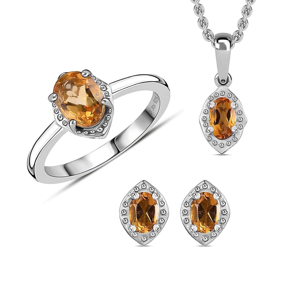 Premium Brazilian Citrine Earrings, Solitaire Ring and Pendant Jewelry Set in Platinum Over Sterling Silver with Stainless Steel Necklace, Birthstone Jewelry Set 20 Inches 1.25 ctw
