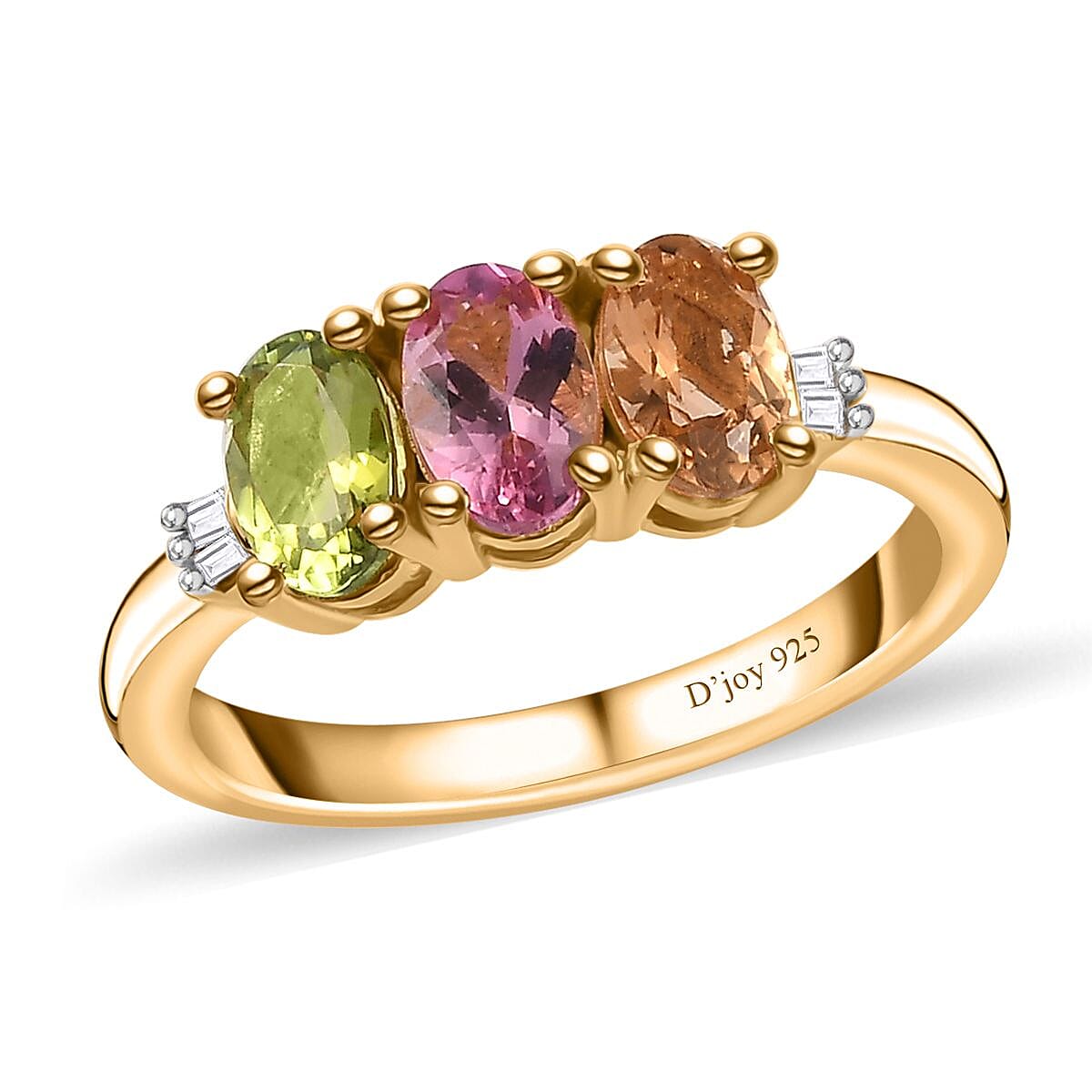 Expertly crafted, this premium Calabar tourmaline three stone ring features pink, green, and golden tourmaline in the center, adorned with baguette white diamonds on the shoulder. This diamond fashion ring is made of vermeil yellow gold over sterling silver, showcasing a stunning trilogy of tourmaline.