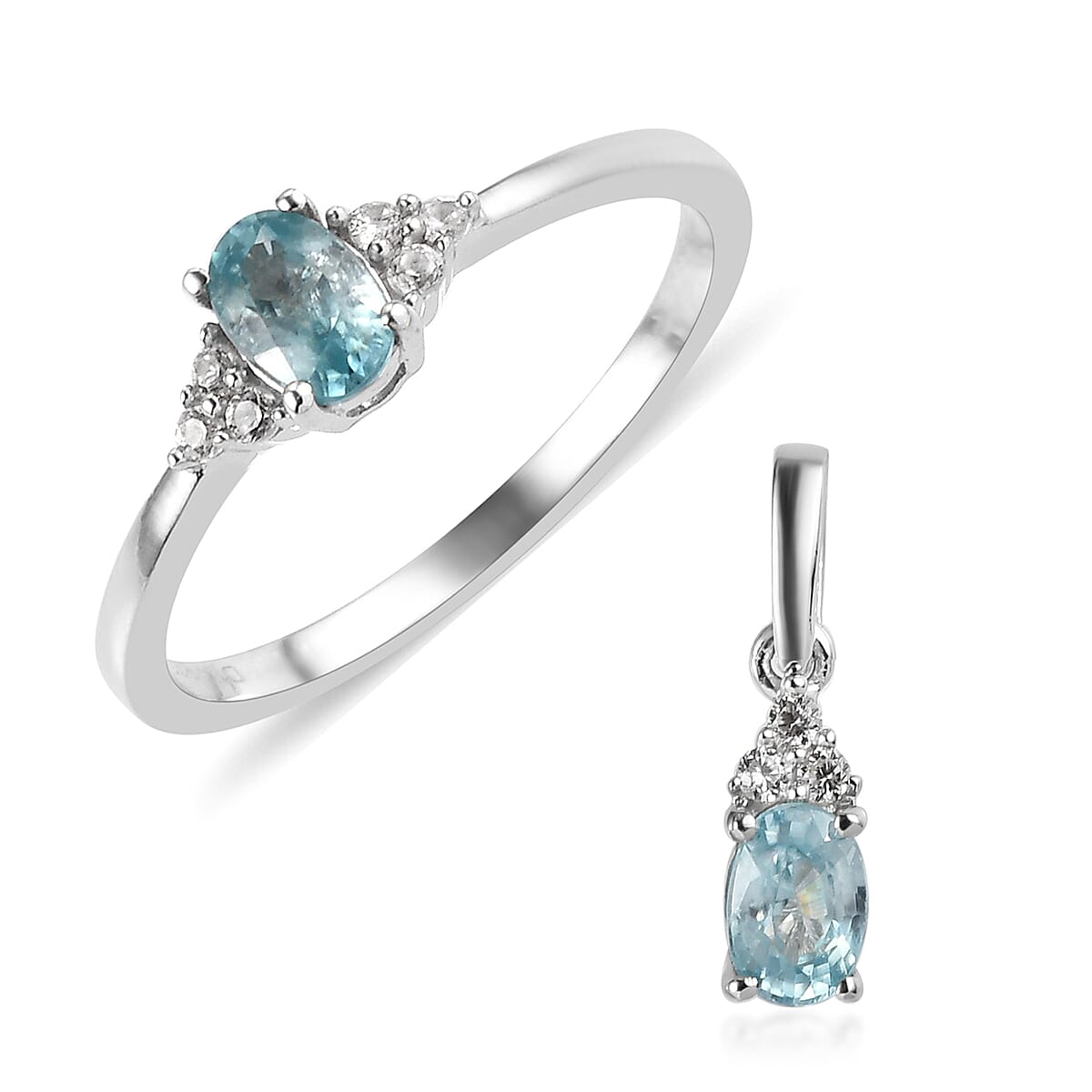 Premium Cambodian Blue Zircon, White Zircon Ring (Size 8.0) and Pendant in Platinum Over Sterling Silver 1.60 ctw