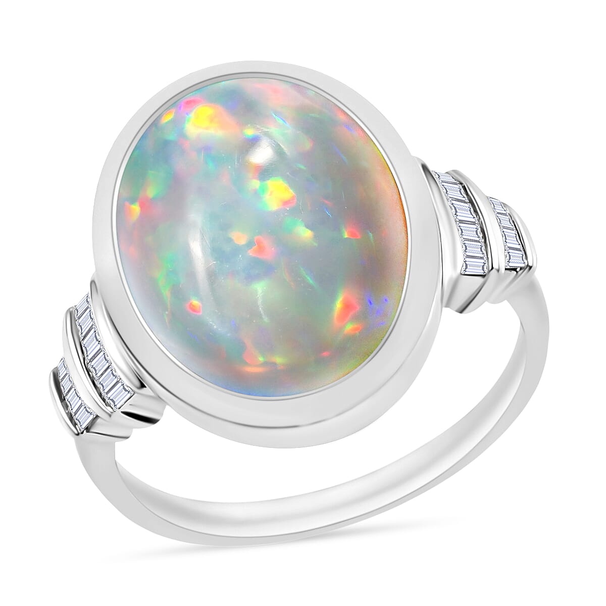 Premium Ethiopian Welo Opal and Diamond 5.70 ctw Ring in Rhodium Over Sterling Silver (Del. in 10-12 Days)