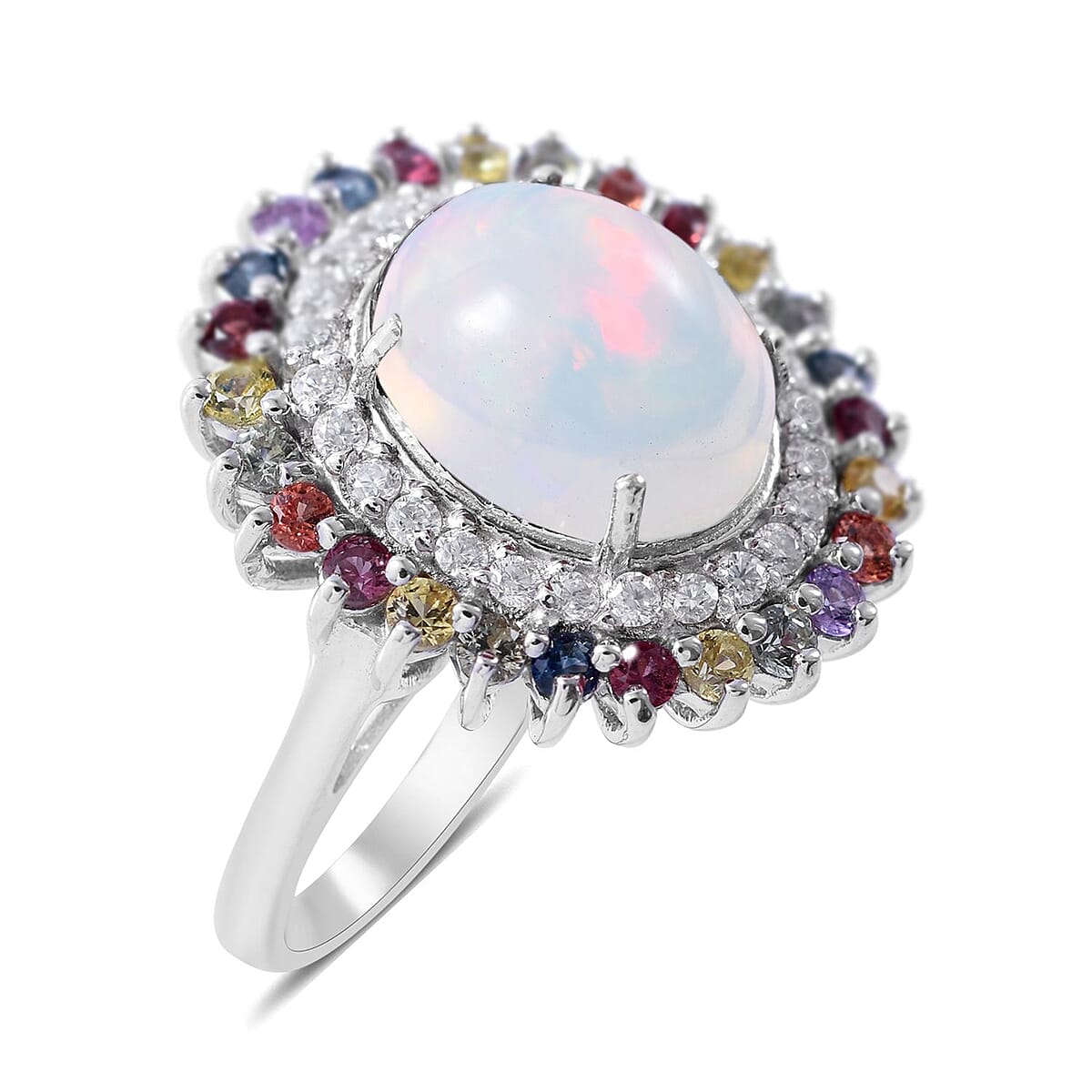 Premium Ethiopian Welo Opal and Multi Gemstone 4.35 ctw Double Halo Ring in Platinum Over Sterling Silver (Size 9.0)