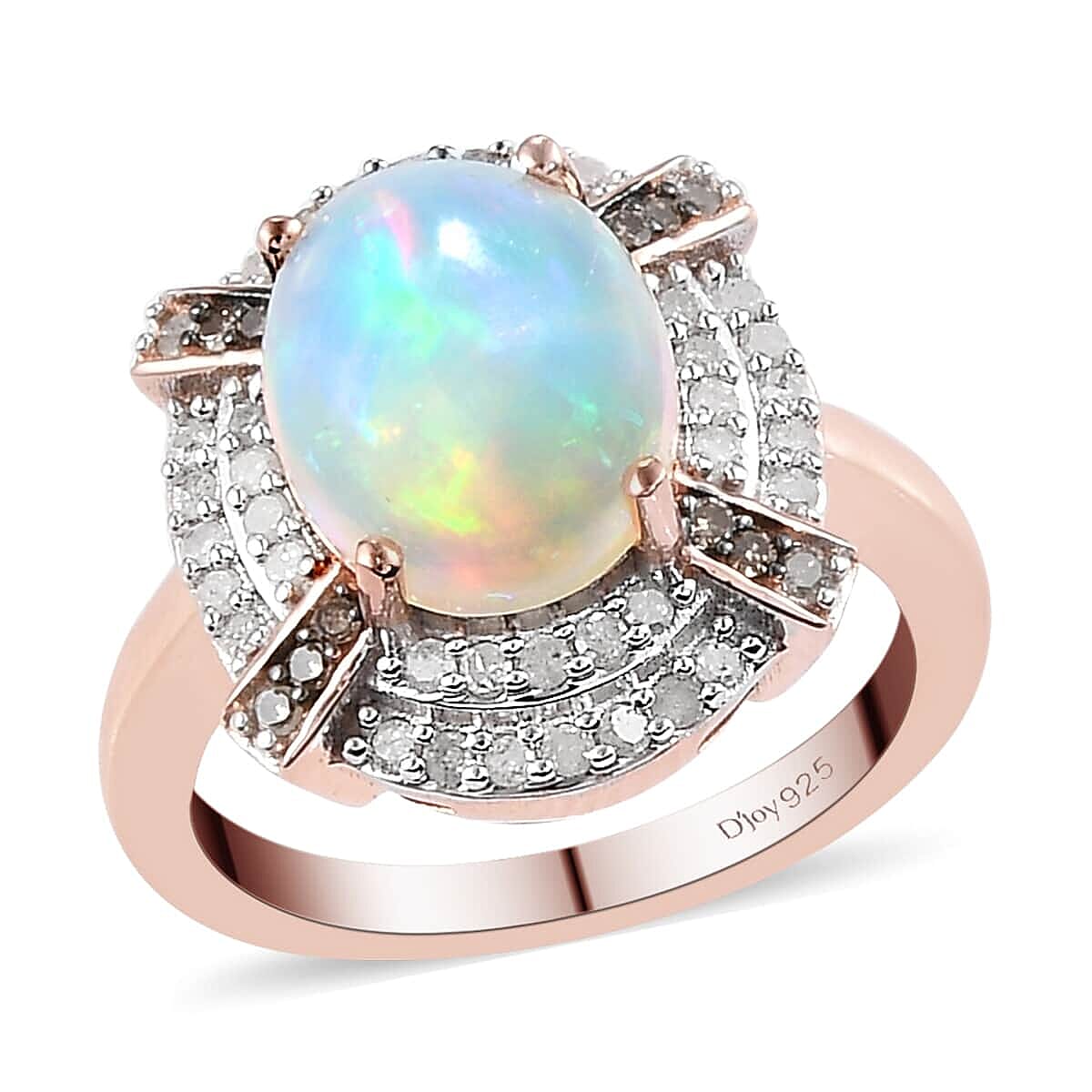 Premium Ethiopian Welo Opal, Natural Champagne and White Diamond Double Halo Ring in Vermeil Rose Gold Over Sterling Silver (Size 9.0) 2.60 ctw