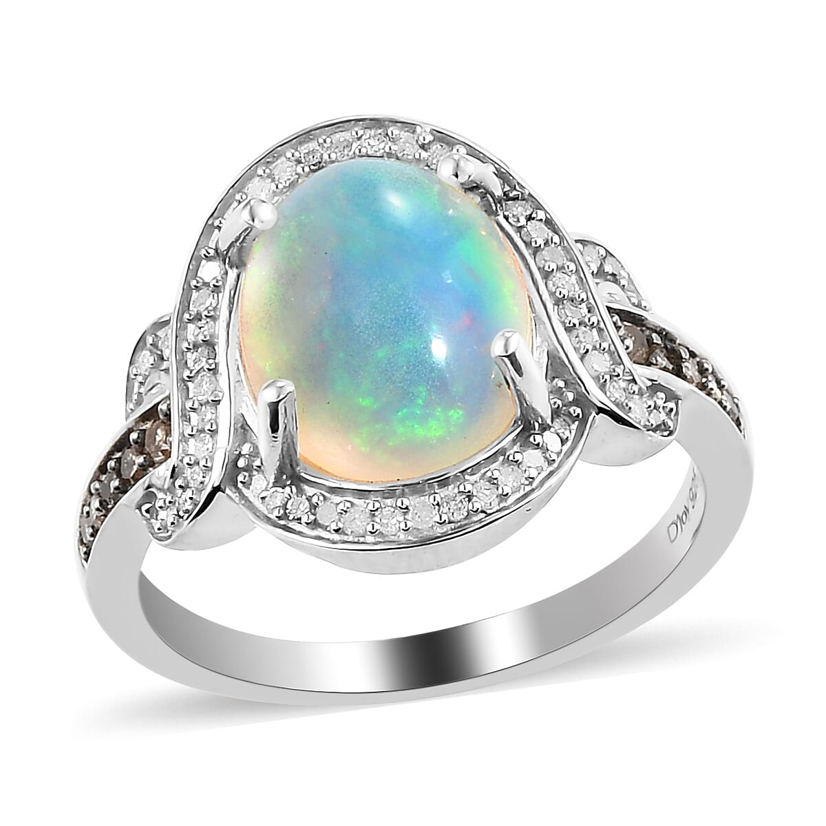 Premium Ethiopian Welo Opal, Natural Champagne and White Diamond Ring in Platinum Over Sterling Silver (Size 7.0) 2.40 ctw
