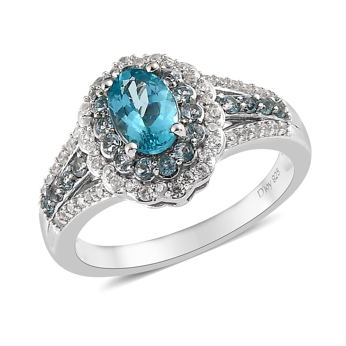 Unleash your enchanting persona with our premium Madagascar Paraiba apatite ring in sterling silver. An oval-shaped apatite, nestled amidst a dual halo of multi-gemstones, blossoms into a radiant, colorful floral design. Adorned further by a split shank dotted with multi-gemstones and graced with platinum over sterling silver, this women’s apatite ring is a statement of absolute elegance.