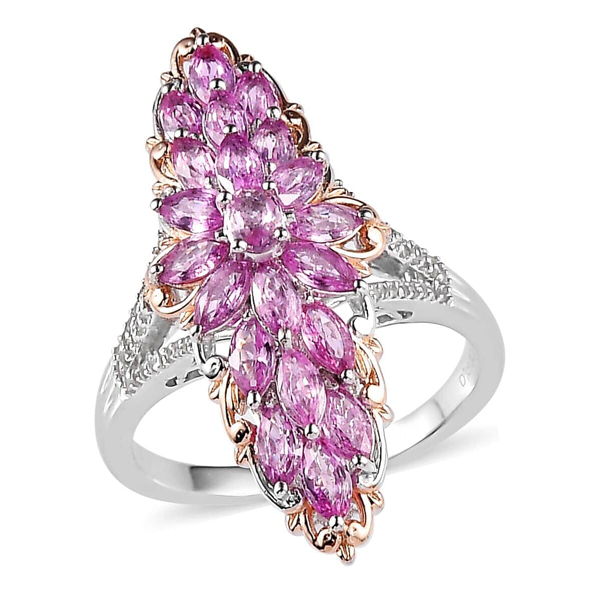 Premium Madagascar Pink Sapphire and White Zircon Elongated Ring in Vermeil Rose Gold and Platinum Over Sterling Silver (Size 6.0) 4.25 ctw