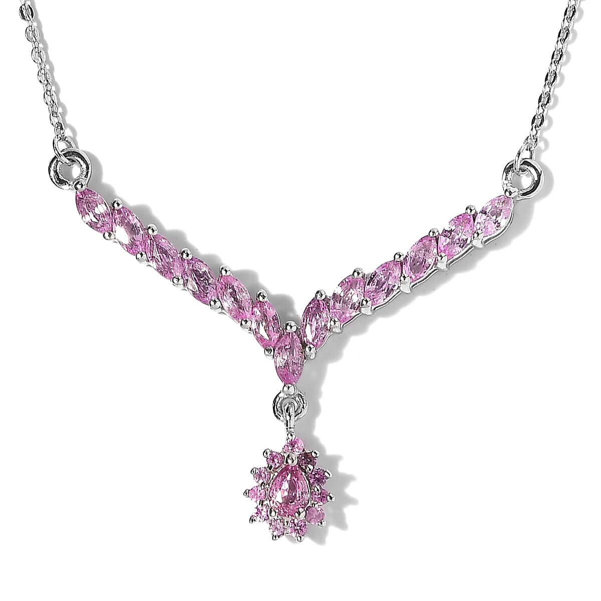This premium Madagascar pink sapphire necklace is a luminous delight and has an enigmatic sheen that shimmers brilliantly. Featuring a V-shape design with drop charm, this premium Madagascar pink sapphire necklace is perfect for adding a unique sparkle to your wardrobe staples. This drop charm is drenched in sterling silver with a matinee chain.