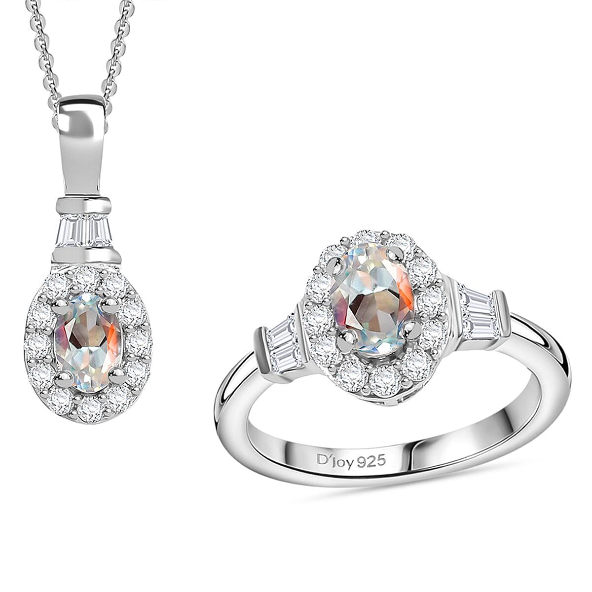 Premium Malagasy Moonstone and Moissanite 1.50 ctw Halo Ring (Size 8.0) and Pendant Necklace in Rhodium Over Sterling Silver 20 Inches