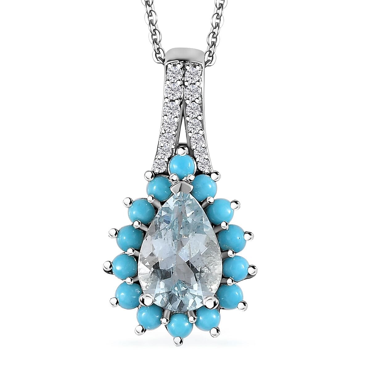 This aquamarine sunburst pendant necklace boasts a pear-shaped Mangoro aquamarine as its centerpiece, enveloped by Sleeping Beauty Turquoise, forming a halo design. Adorned with white zircon accents on the bail, the sunburst pendant exudes sophistication. Crafted in durable sterling silver, this multi-gemstone necklace promises longevity while retaining its timeless allure.