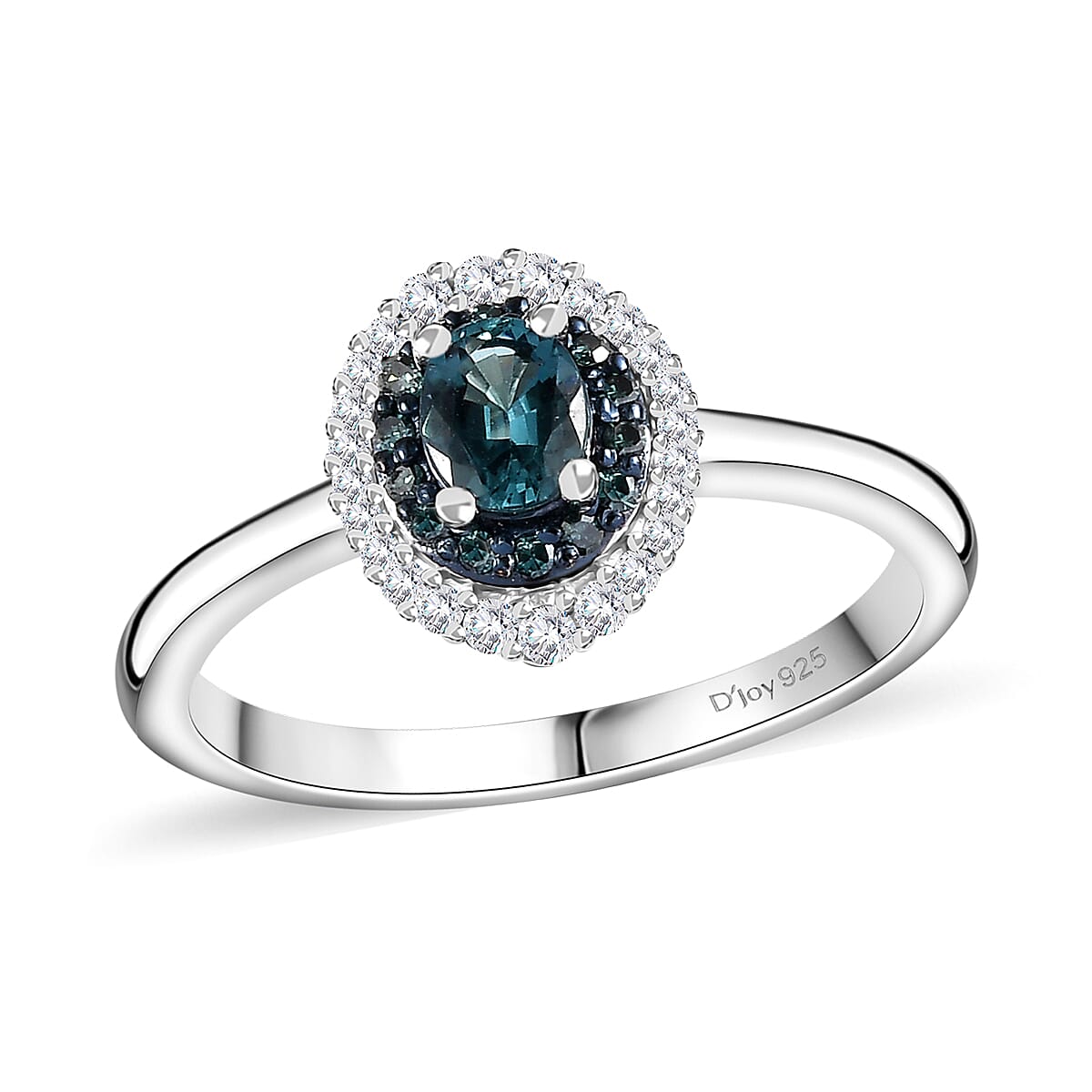 This premium Monnte Belo indicolite, blue and white diamond double halo ring for women symbolizes eternal love. It features a premium Monte Belo indicolite, a rare tourmaline variety known for its dusty indigo blue to aqua hues. The indicolite is encircled with blue and white diamonds, forming a stunning halo. The gemstones are prong-set for a secure grip, and the silver ring is crafted from durable and affordable sterling silver.