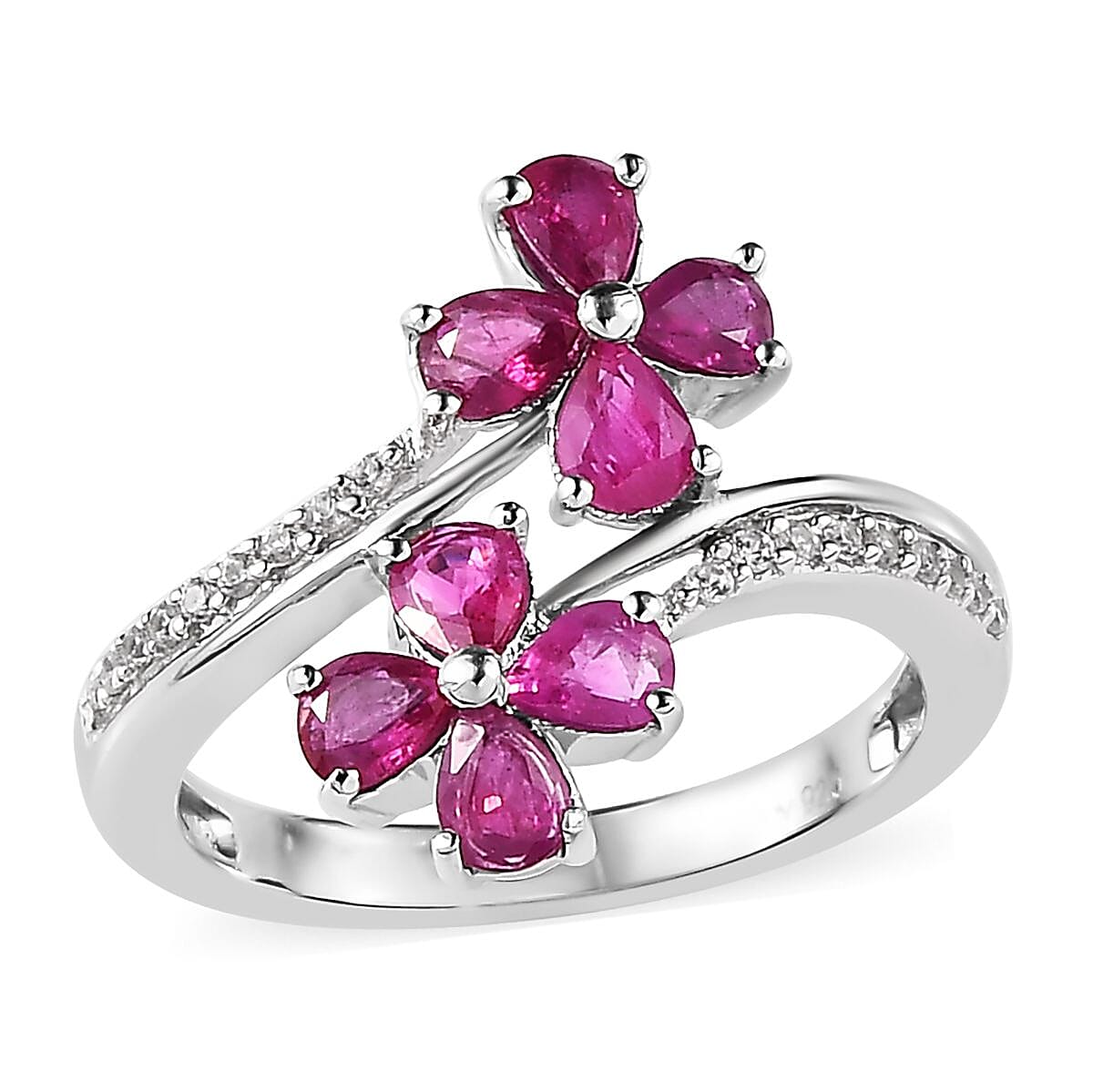 Premium Montepuez Ruby and White Zircon Bypass Floral Ring in Platinum Over Sterling Silver (Size 6.0) 1.35 ctw