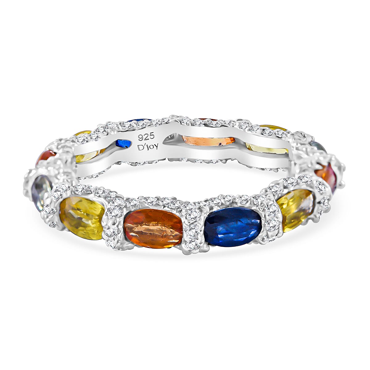 This multi sapphire and moissanite rainbow ring, crafted in sterling silver, features a vibrant array of gemstones. This colorful design creates a striking visual effect, making it a standout piece to adorn. The durable sterling silver setting enhances both the brilliance of the stones and the band ring's lasting appeal.