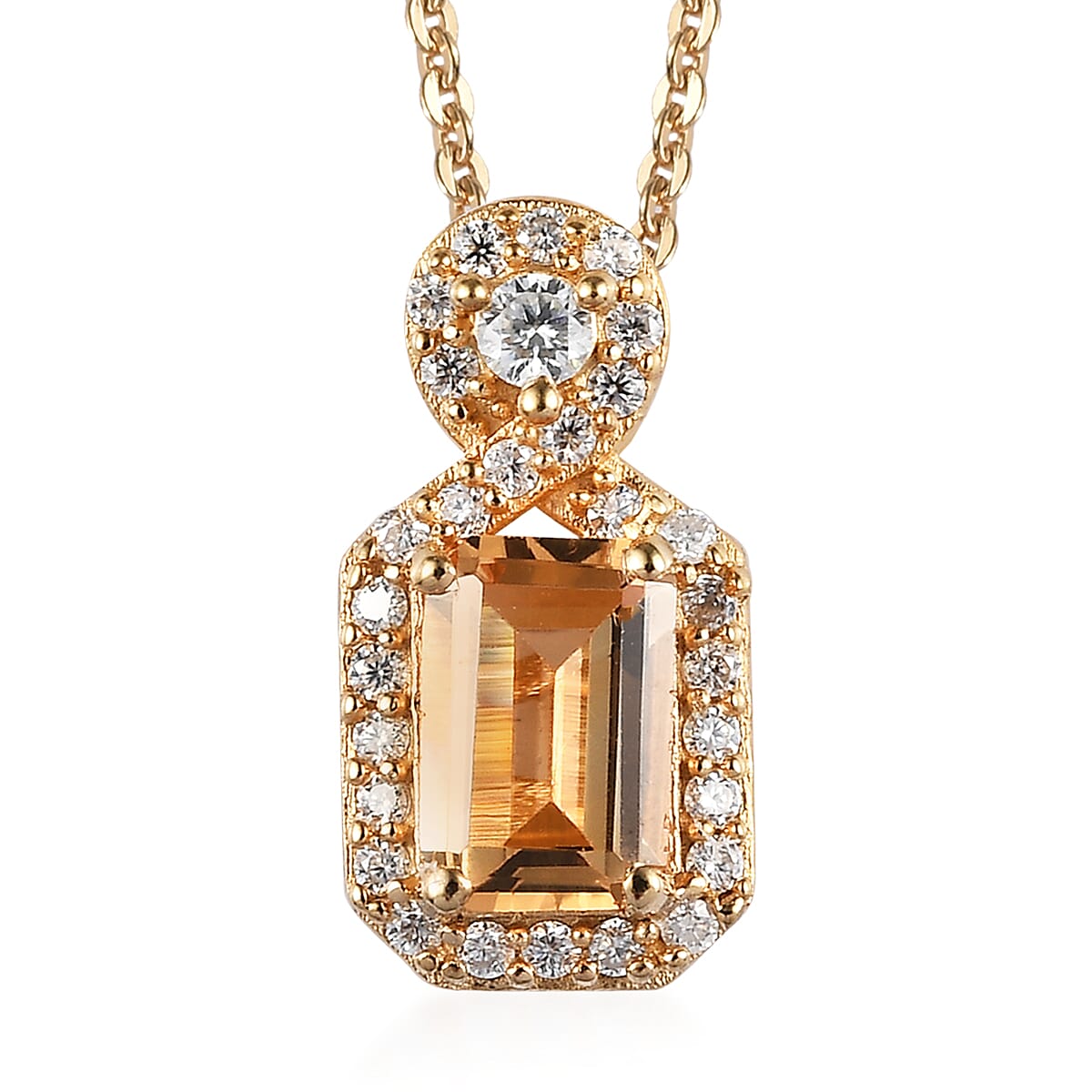 Inspired by the halo theme, this Premium Natural Imperial Topaz and moissanite pendant necklace symbolizes eternal energy. Designed considering the aesthetic needs of jewelry lovers, this pendant features a rectangular-shaped Premium Natural Imperial Topaz engulfed in a moissanite studded halo that flaunts extravagance. The halo frame further extends to form a round shape bail for extraordinary appeal. This amazing pendant is ready to be a part of your collection. Halo is a style that features a larger gemstone surrounded by small gemstones. Yellow gold vermeil-plated sterling silver offers a magnificent palette of inspiration and adds sophistication and glamour to any embellishment. The mysterious and enchanting champagne hues create a mystique that quickly intrigues us all.