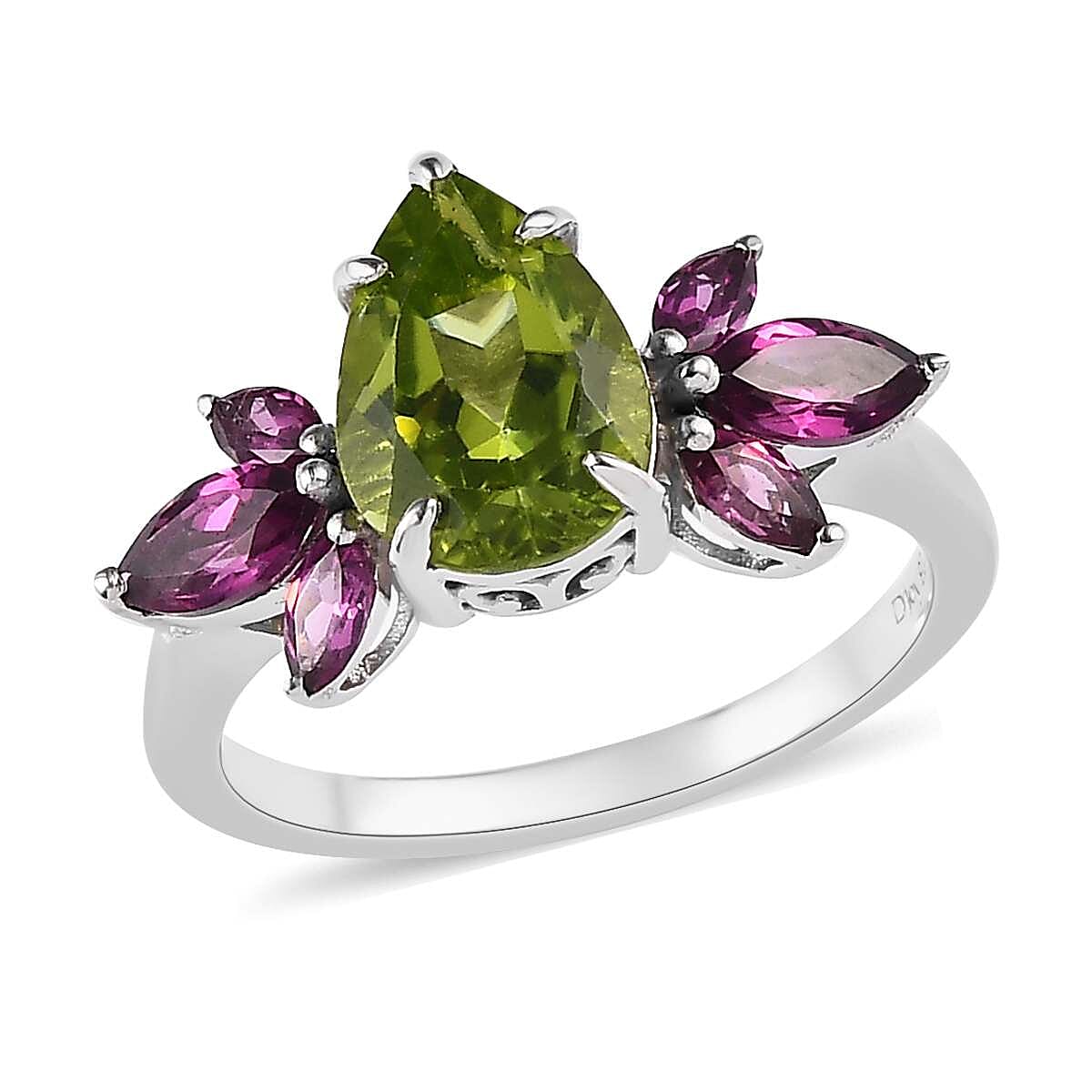 Ignite your elegance with our premium peridot ring. Featuring a pear-shaped peridot in four prongs, accented by trios of marquise-shaped Orissa rhodolite garnets, this women's ring is more than jewelry—it's a fusion of Mother Earth's most exquisite treasures, all set in rhodium over sterling silver.
