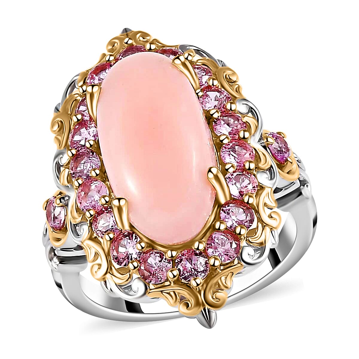 Premium Peruvian Pink Opal and Madagascar Pink Sapphire 5.90 ctw Accent Ring, Floral Halo Ring, Vermeil YG and Platinum Over Sterling Silver Ring, Opal Jewelry, Gifts For Her (Size 10.0)