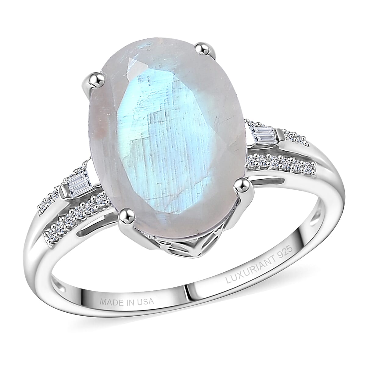 Premium Rainbow Moonstone and Luxuriant Lab Grown Diamond G-H SI 6.30 ctw Prism Glow Ring in Rhodium Over Sterling Silver (Size 10.0)