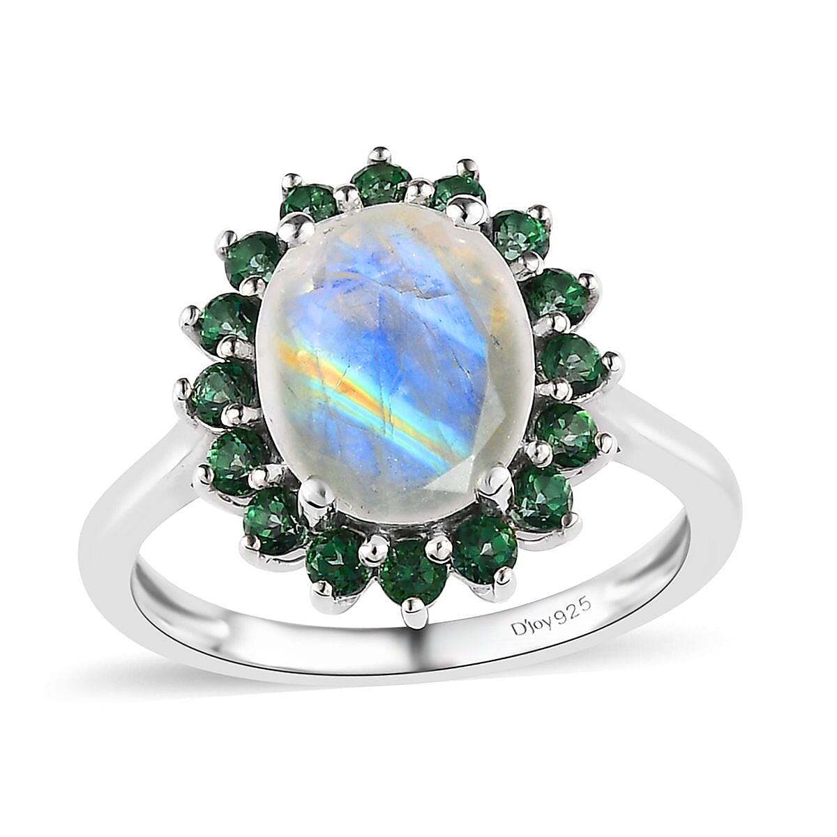 Premium Rainbow Moonstone and Signity Rainforest Topaz Halo Ring in Platinum Over Sterling Silver (Size 8.0) 3.10 ctw