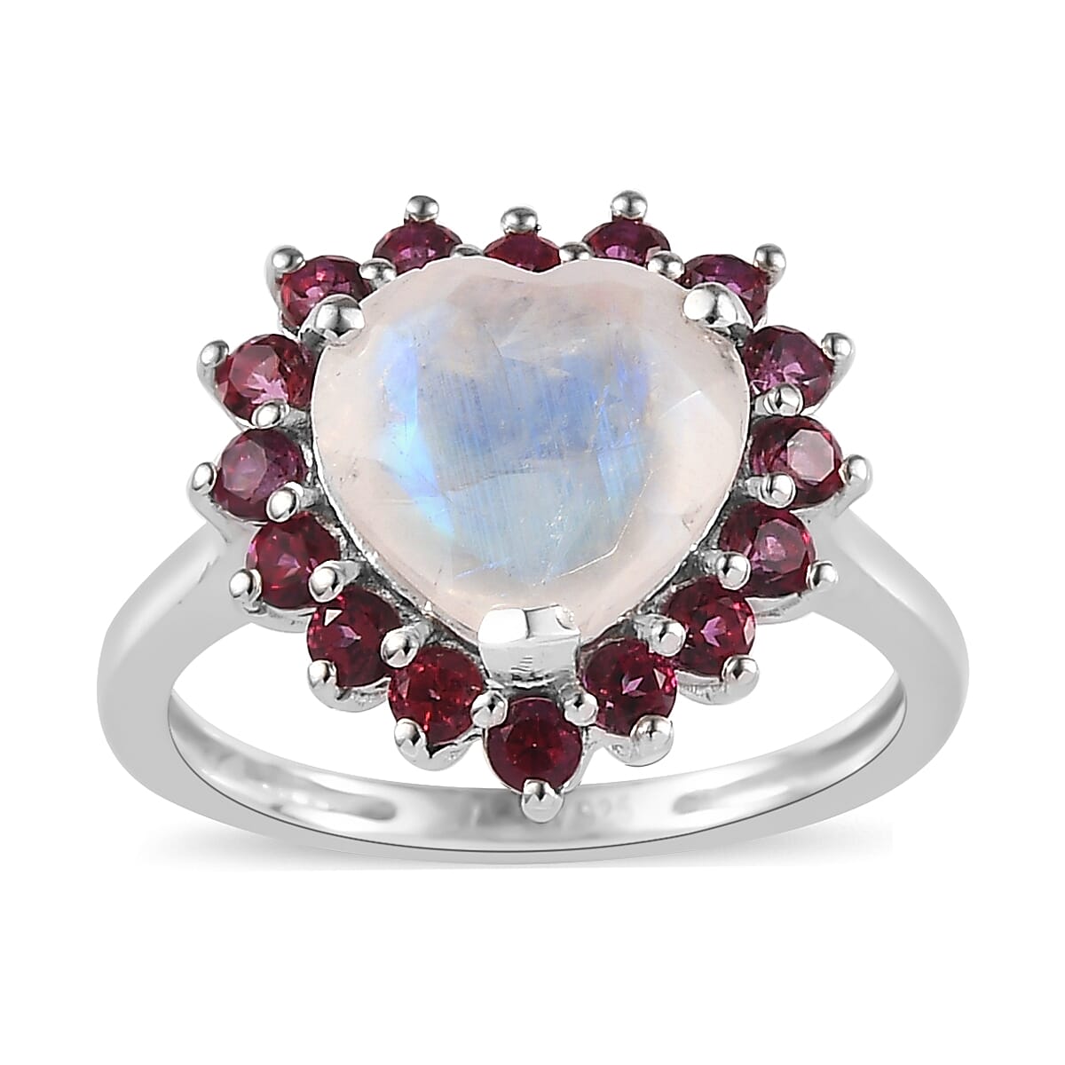 Premium Rainbow Moonstone and Signity Blazing Red Topaz Heart Ring in Platinum Over Sterling Silver (Size 10.0) 3.10 ctw