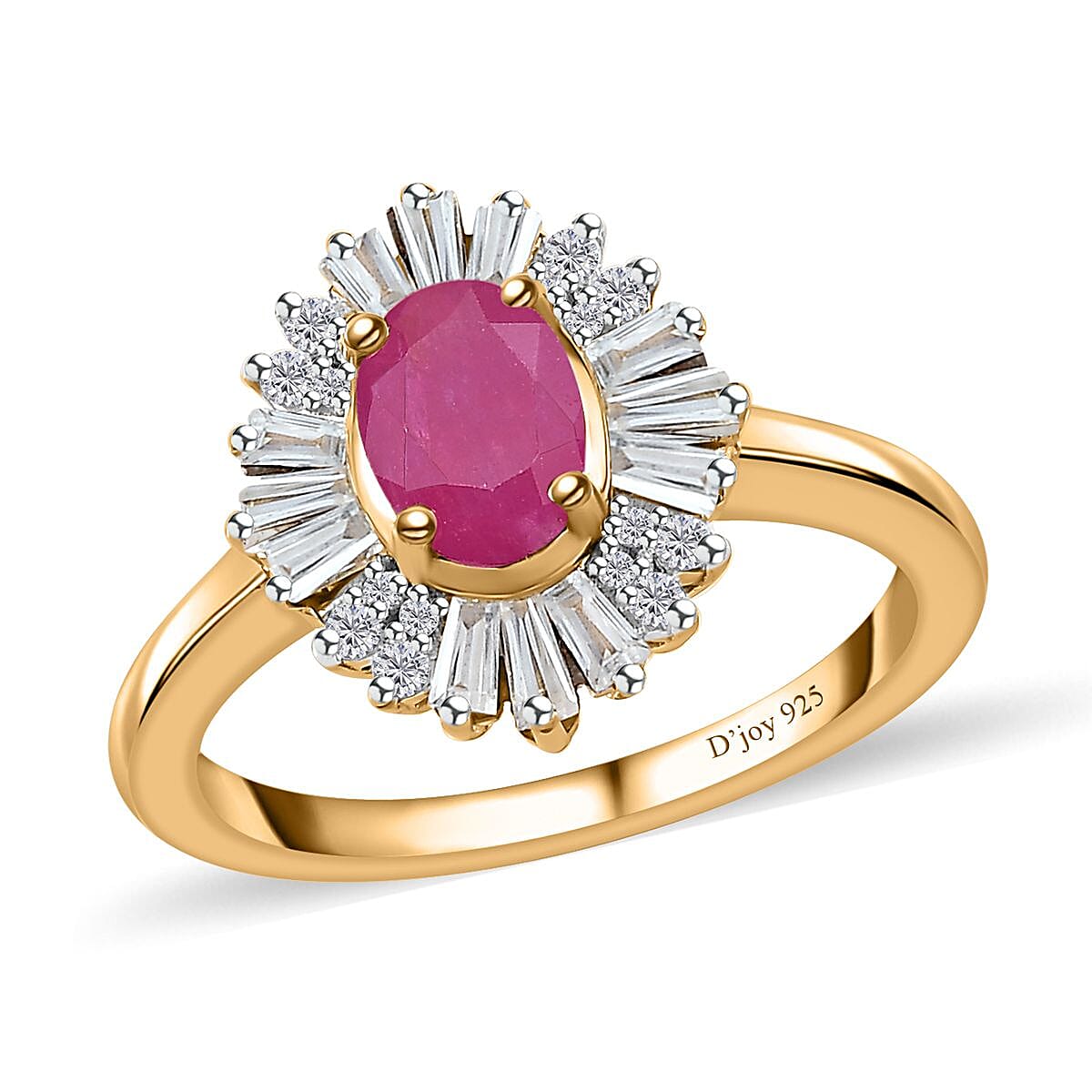 A ruby ring for women featuring a prong-set ruby center stone surrounded by prong-set white zircon stones in a ballerina frame. Crafted in vermeil yellow gold over sterling silver this ruby ballerina ring ensures durability and shine.