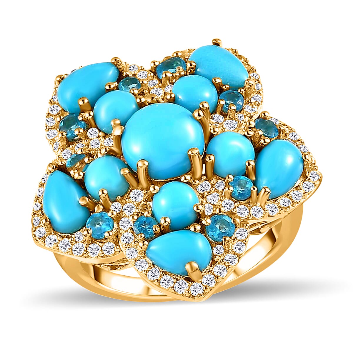 Premium Sleeping Beauty Turquoise Floral Cluster Ring, Multi Gemstone Accent Ring, Vermeil Yellow Gold Over Sterling Silver Ring, Turquoise Jewelry For Her 6.25 ctw